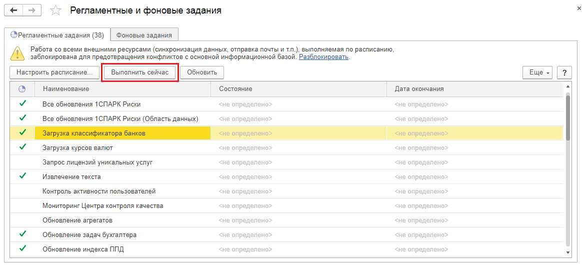 На панели действий открытого списка регламентных заданий предоставлена возможность запустить обновление классификатора вручную по кнопке «Выполнить сейчас».