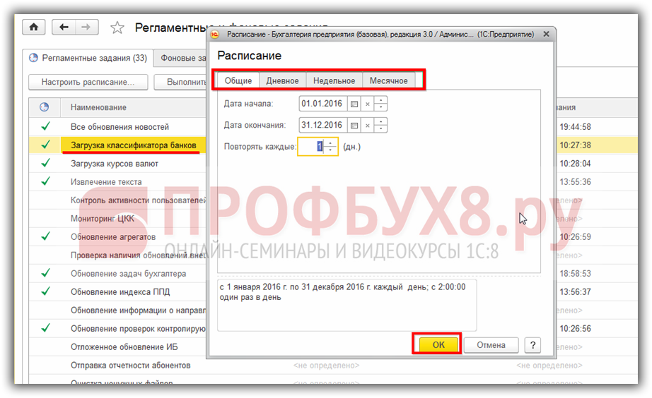 По умолчанию данное регламентное задание выполняется ежедневно. При необходимости существует возможность отключения или изменения периодичности, что было рассмотрено ранее, но рекомендуется предварительно проанализировать частоту запросов на создание новых банков и изменения нормативно-справочной информации.