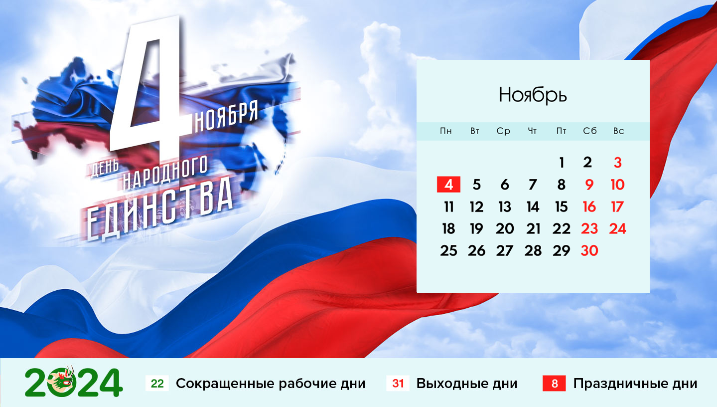Ноябрь тоже не порадует многих, ведь ожидалось, что выпадающий на понедельник День народного единства подарит 3-дневный период отдыха, но с учетом изменений, внесенных в календарь Постановлением Правительства, отдыхать будем только 2 дня подряд – воскресенье 03.11.24 и понедельник 04.11.24. Предшествующая этому периоду суббота 02.11.24 будет полноценным рабочим днем (отрабатываем за раннее начало новогодних праздников 2025 года).