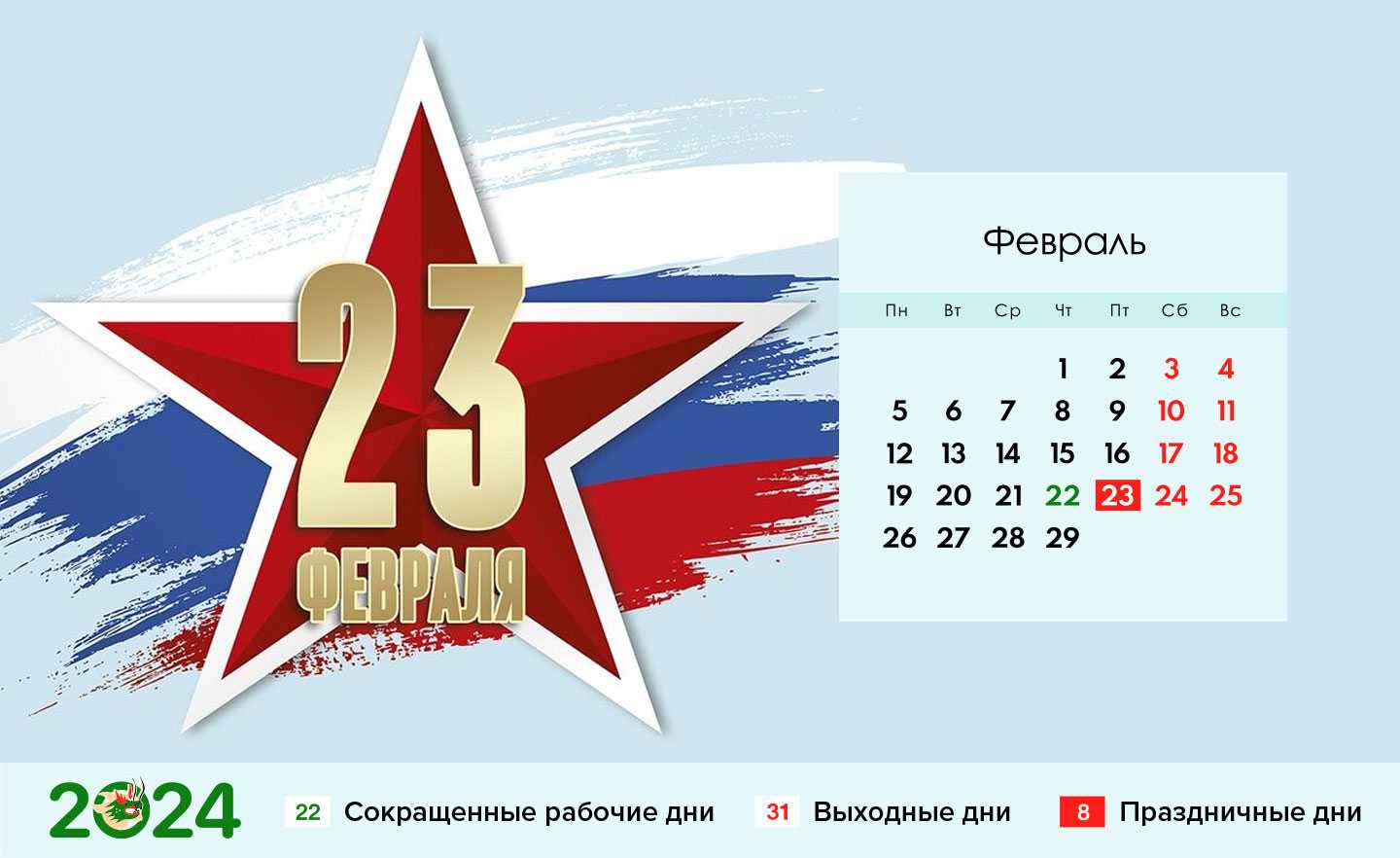 Февраль подарит короткий период отдыха длительностью всего в 3 дня (с пятницы 23.02.24 по воскресенье 25.02.24 включительно). Предшествовать выходным будет сокращенный рабочий день (четверг 22.02.24).