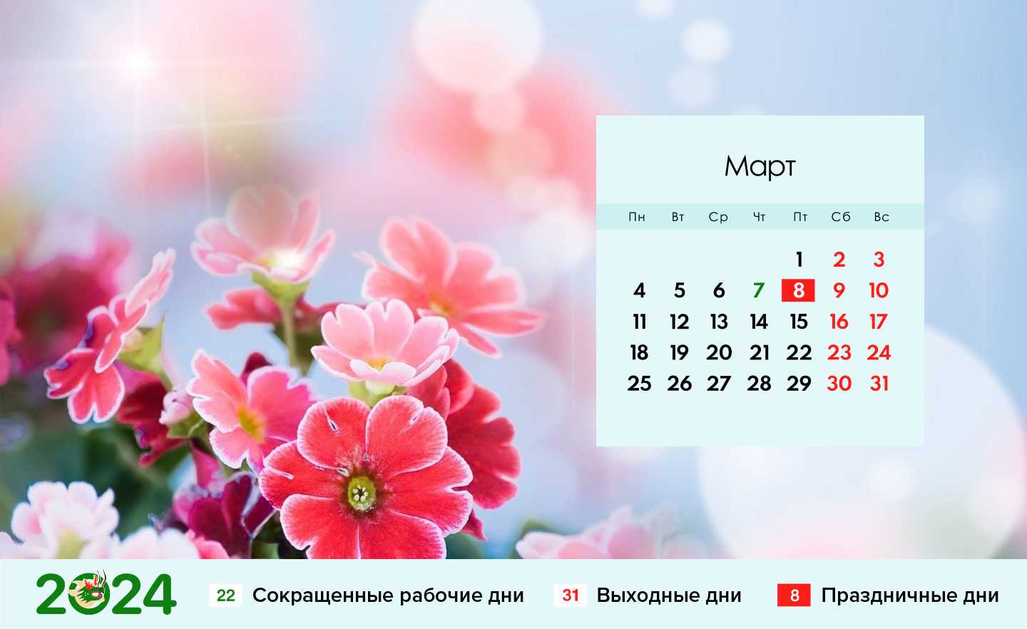 Март тоже порадует короткой рабочей неделей и трехдневным периодом отдыха (с пятницы 08.03.24 по воскресенье 10.03.24 включительно). Предшествовать 8 марта будет короткий рабочий четверг 07.03.24.