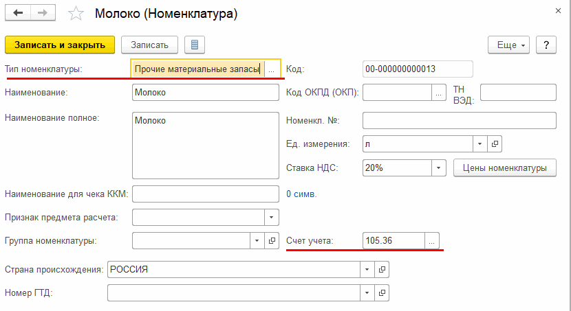 Совет: чтобы в документах Покупка материалов и Поступление МЗ счет 105.36 и код КОСГУ 346 формировались автоматически, для номенклатуры «Молоко» (в элементе справочника Номенклатура) следует выбрать тип МЗ — Прочие материальные запасы (рис. 1).