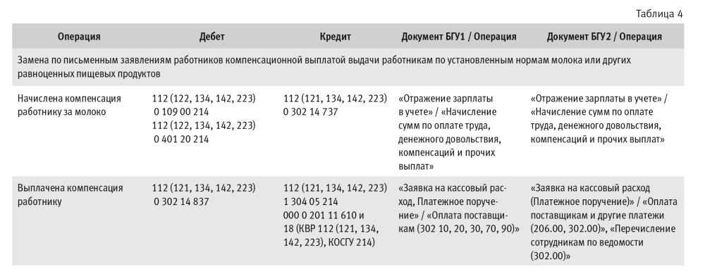 Бухгалтерские записи по отражению в 2019 году компенсационной выплаты взамен выдачи работникам по установленным нормам молока или других равноценных пищевых продуктов и документы, которыми они формируются в БГУ1 и БГУ2, приведены в таблице 4.