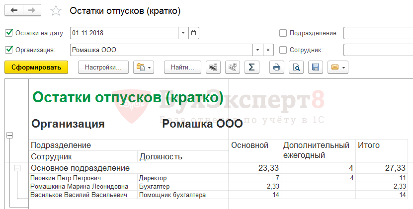 Шаг 3. Сформируйте отчет по остаткам отпусков в 1С 8.3 ЗУП 3.1
