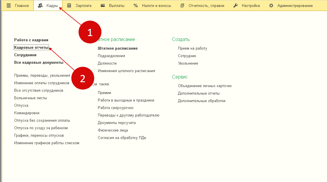 В 1С 8.3 ЗУП есть отчет по остаткам отпусков всех сотрудников. Для его формирования зайдите в раздел «Кадры» (1) и кликните на ссылку «Кадровые отчеты» (2). Откроется список всех отчетов.