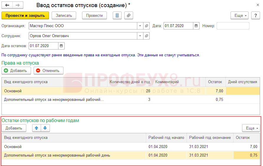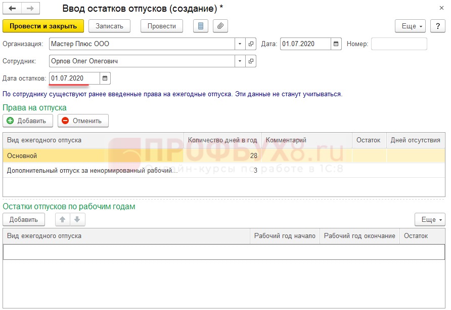 Теперь можно вводить остатки, не вводя при этом право на сам отпуск. Например, когда-то отпуск полагался сотруднику и был им заработан, но теперь этот отпуск сотруднику больше не положен, а остались только его неиспользованные остатки.