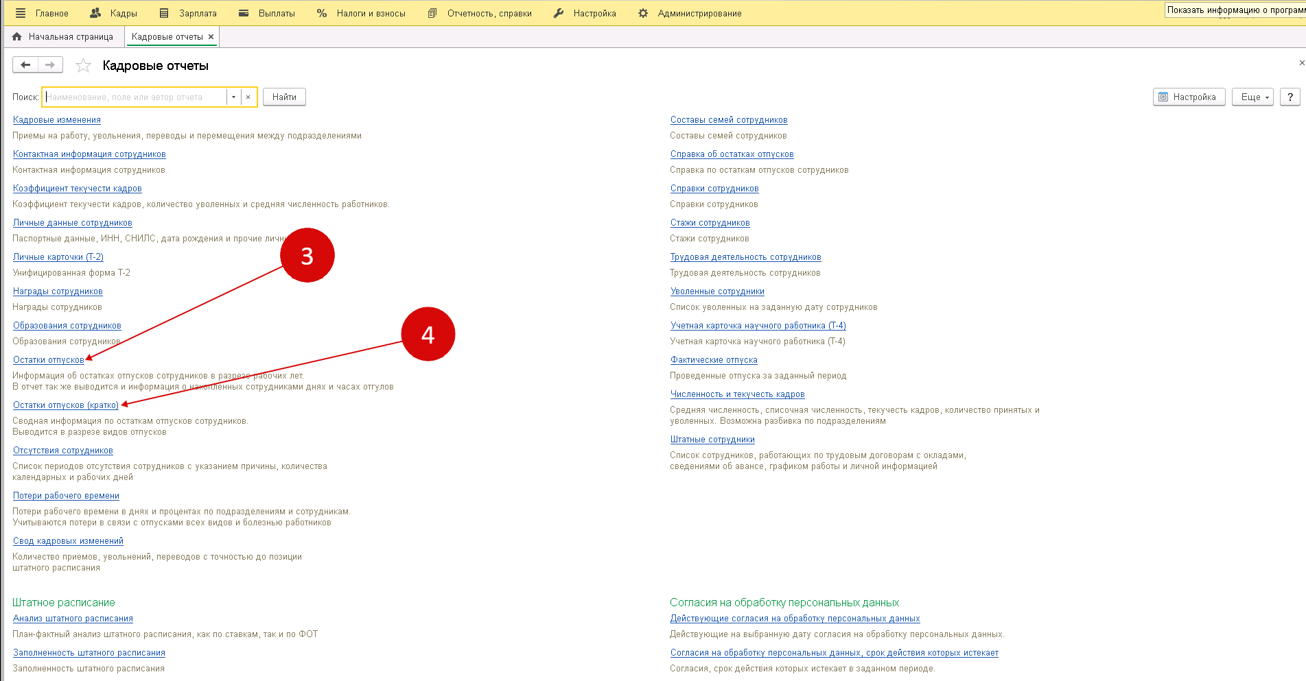 - «Остатки отпусков (кратко)» (4). Сокращенный вариант отчета.