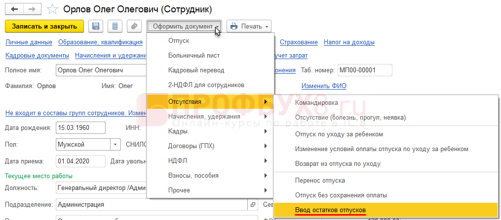 Документ программы « » можно также ввести из справочника «Сотрудники», выделив или открыв форму сотрудника и нажав «Оформить документ» – Отсутствия – Ввод начальных остатков отпусков.