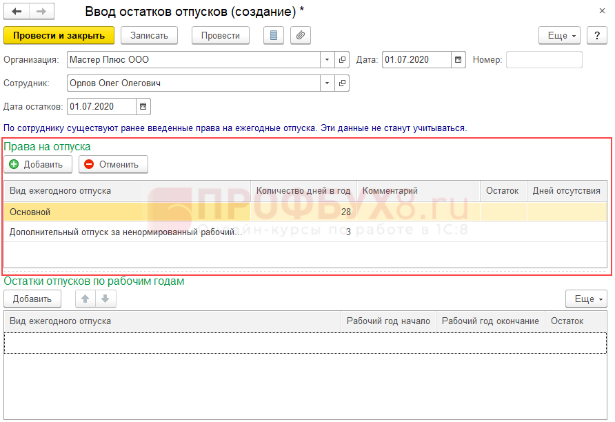 После этого, если у сотрудника были зарегистрированные ранее права на отпуска, то они подтянутся в документ в табличную часть Права на отпуска: