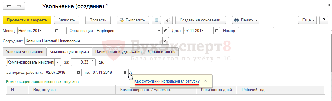 - Компенсация за неиспользованный отпуск при увольнении в 1С 8.3 ЗУП