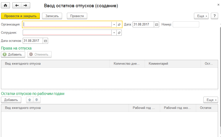 В этом документе нужно внести сотрудника, дату остатков, в табличную часть заносят вид (или виды) ежегодного отпуска, затем для каждого вида отпуска – период рабочего года и остаток отпуска на дату остатков.