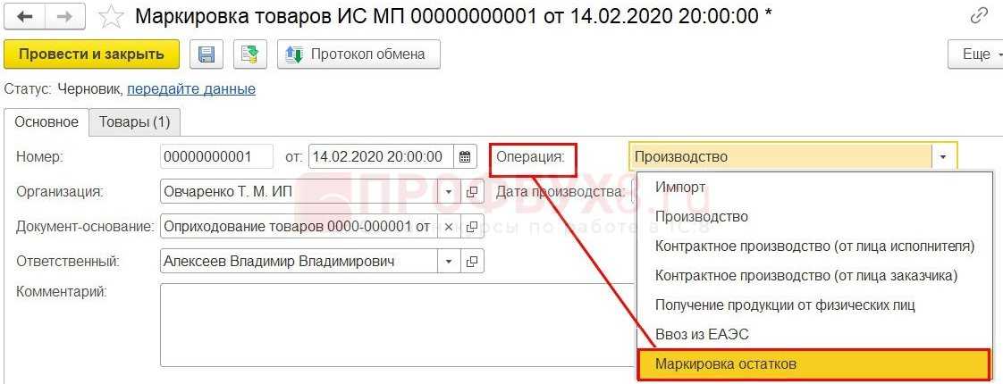 Выберите вид операции Маркировка остатков в документе Маркировка товаров ИС МП.
