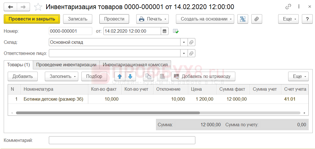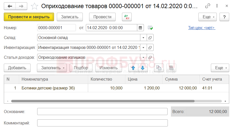 Создайте документ Инвентаризация товаров, затем введите на его основании документ Оприходование товаров.