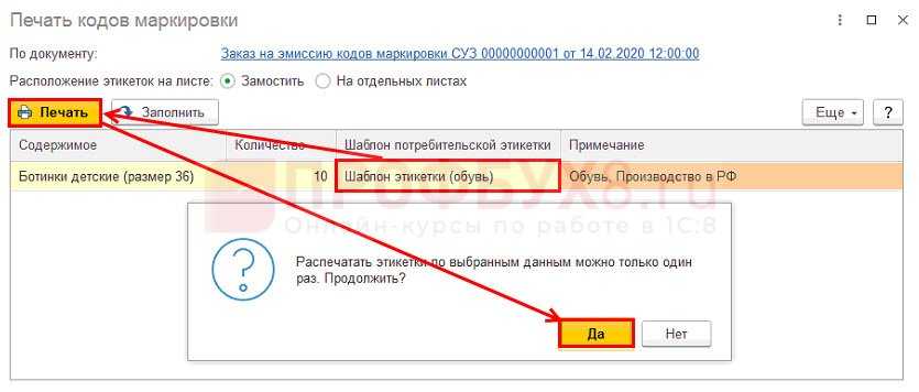 Выберите шаблон этикетки Шаблон этикетки (обувь) и нажмите кнопку Печать. Затем нажмите кнопку Да в форме сообщения о печати этикеток в единственном экземпляре.