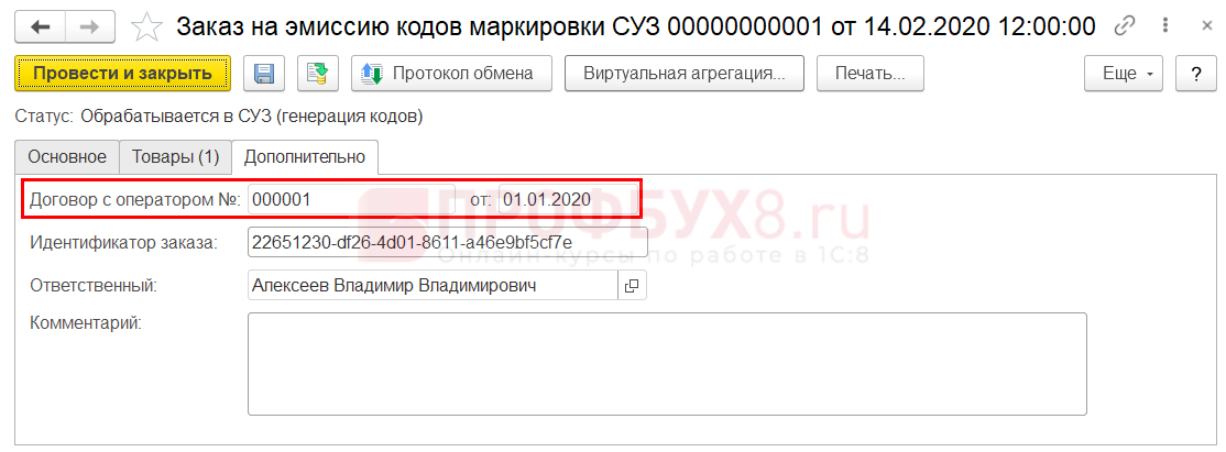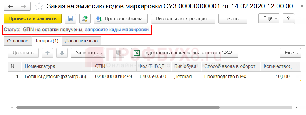 Укажите номер договора с оператором ЦРПТ на вкладке Дополнительно документа Заказ на эмиссию кодов маркировки. После заполнения документа выполните команду Запросите GTIN на остатки.