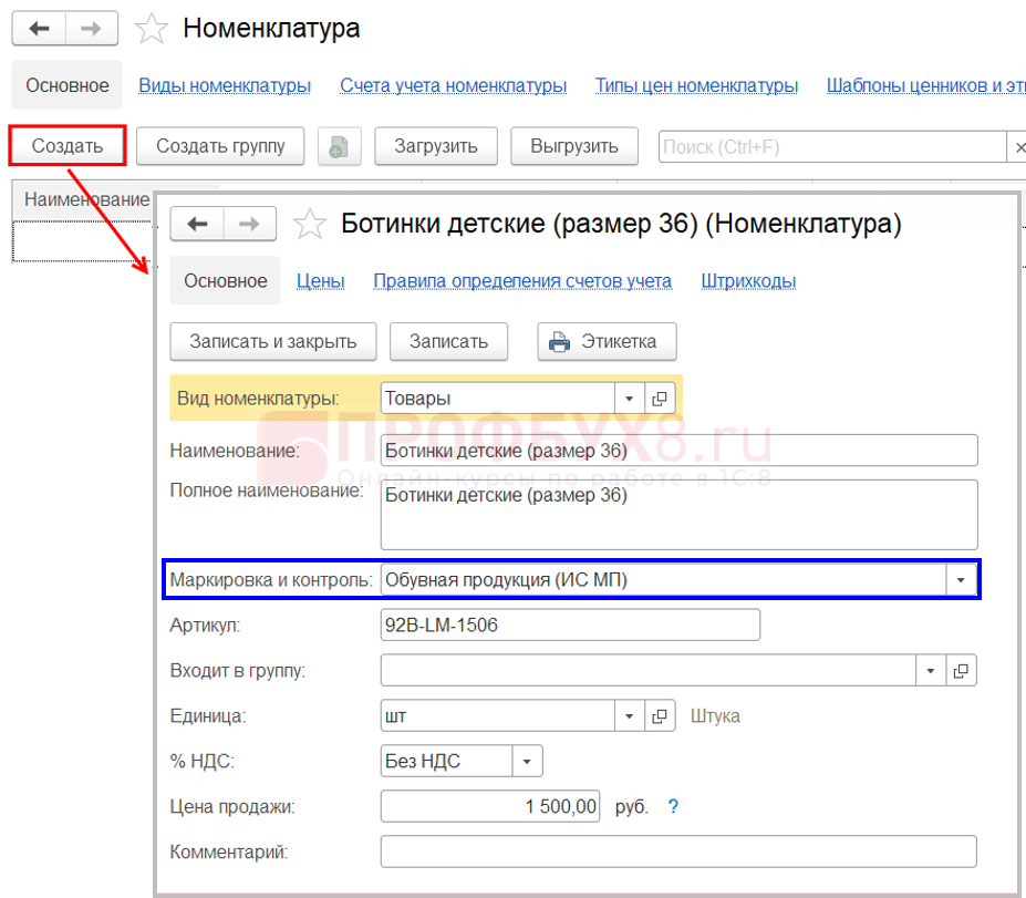 Создайте элемент справочника Номенклатура или отредактируйте имеющиеся.