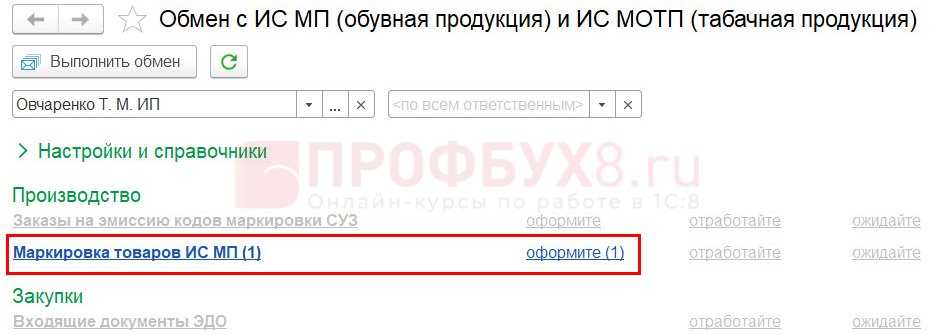 Откройте панель Обмен с ИС МП (обувная продукция) и ИС МОТП (табачная продукция) и нажмите ссылку Оформите напротив документа Маркировка товаров.