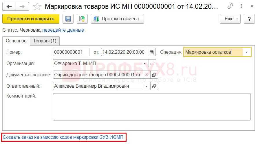 После сохранения документа Маркировка остатков в нижней части документа станет доступна команда создания документа Заказ на эмиссию кодов маркировки. Нажмите на эту ссылку.