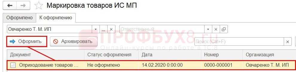 Нажмите кнопку Оформить, предварительно выделив документ Оприходование товаров.