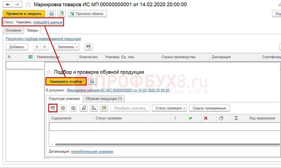 С помощью сканера штрихкодов отсканируйте распечатанные коды маркировки в табличную часть Структура упаковок, затем выполните команду Завершить подбор. После завершения подбора выполните команду Передайте данные.