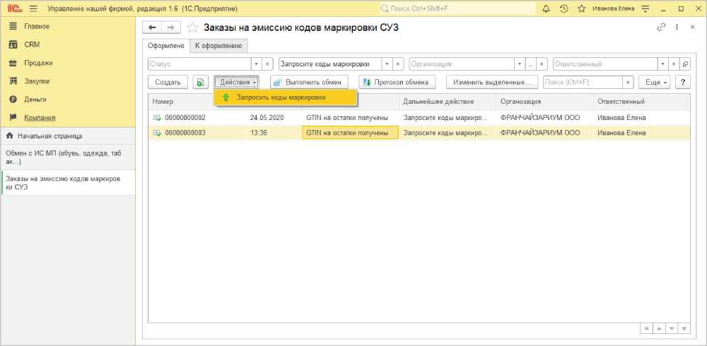 Документ «Заказ на эмиссию кодов» формируется в базе данных и далее отправляется в систему «Честный знак».
