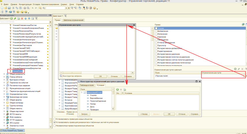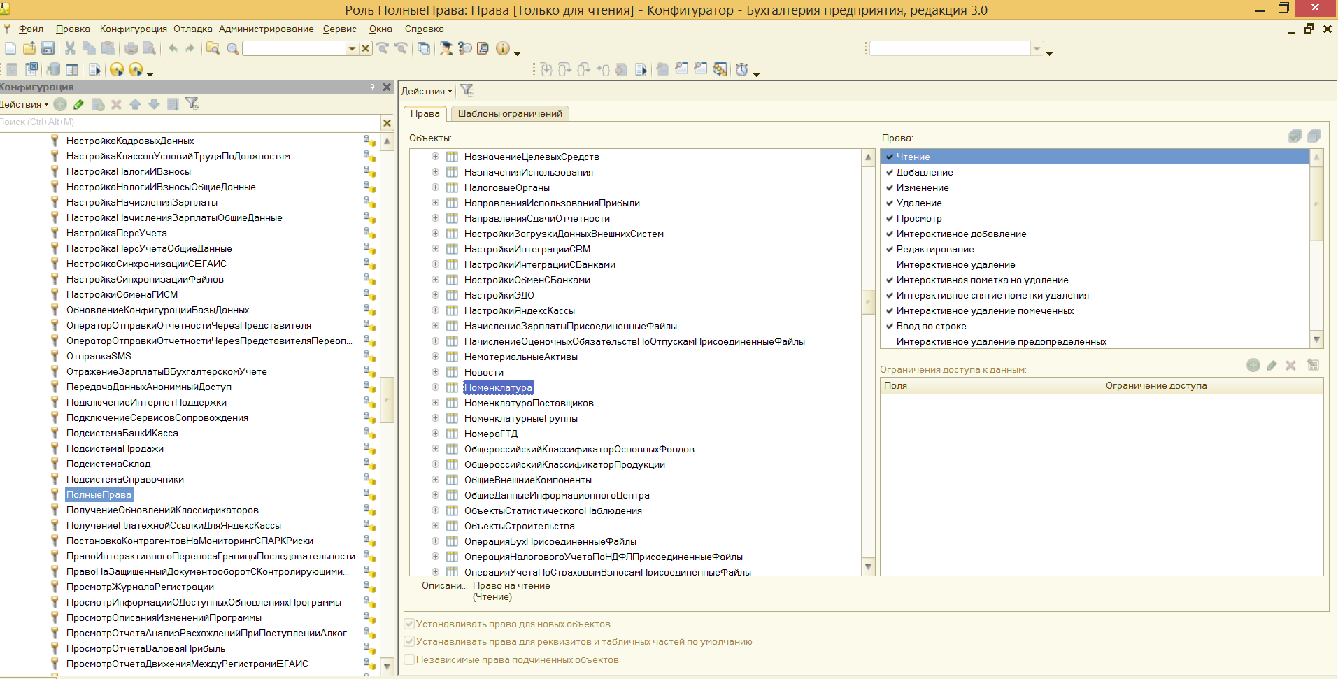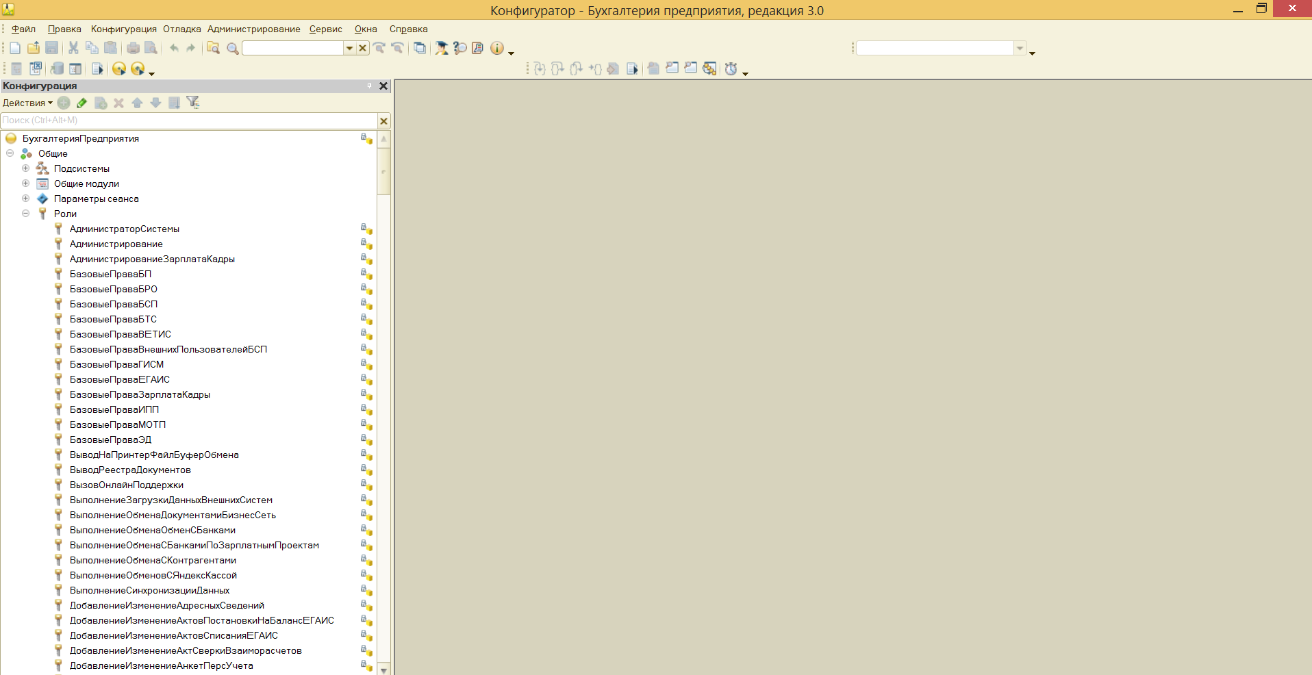 Чтобы не путаться в бесконечном разнообразии ролей, рекомендуем создать собственные роли. Для этого зайдите в дерево метаданных.