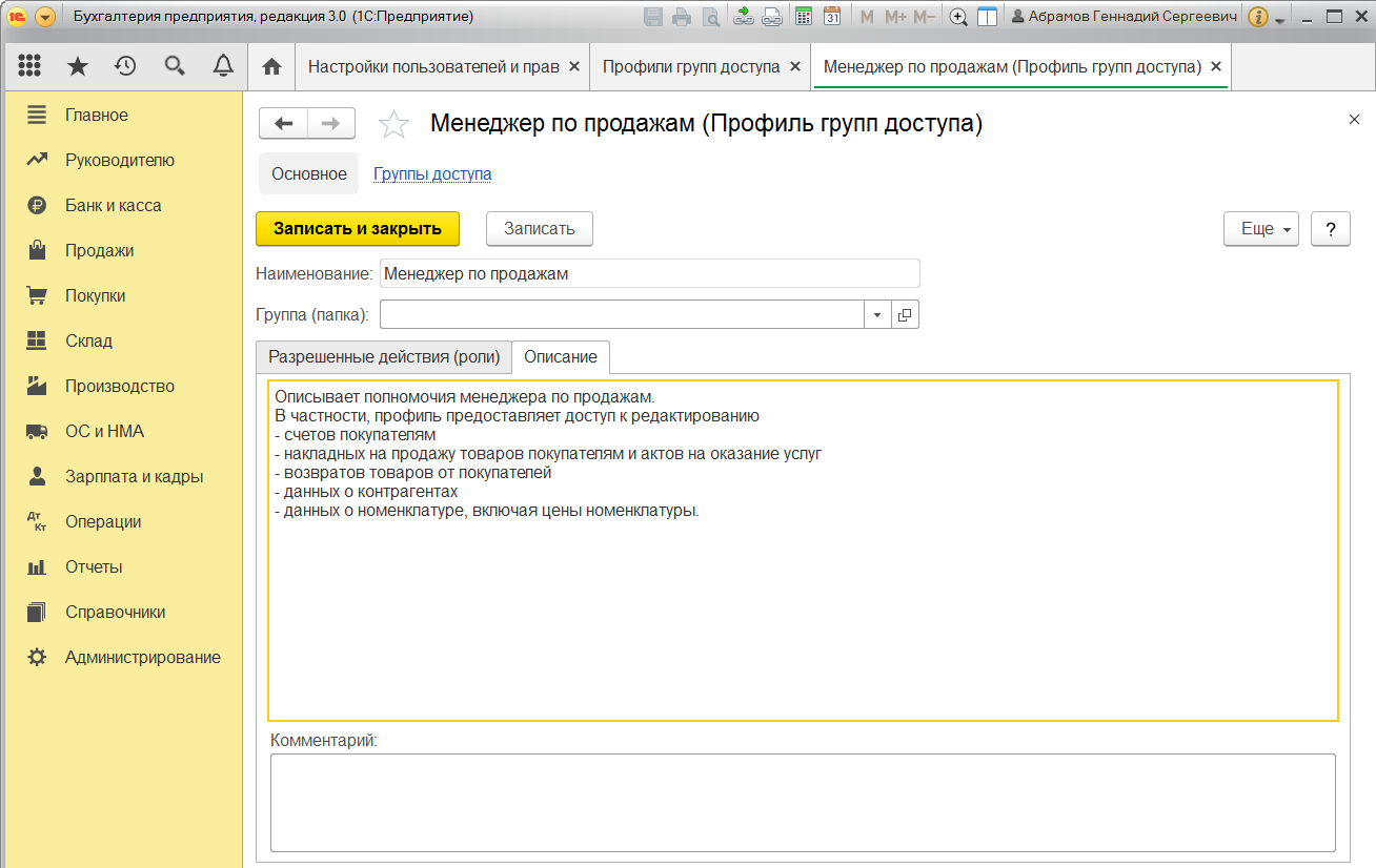 Каждый элемент справочника «Профили групп доступа» является интегратором ролей. Ссылка на этот справочник находится по адресу «Администрирование > Настройка пользователей и прав > Группы доступа > Профили групп доступа». Разработчики уже описали в нём наиболее востребованные профили.