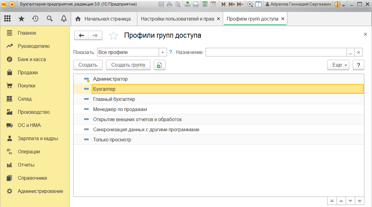 Чтобы открыть этот справочник, надо перейти по ссылкам «Администрирование > Настройка пользователей и прав > Группы доступа > Группы доступа». Одна группа доступа с названием «Администраторы» в нём предустановлена. Остальные создаются по мере необходимости пользователями с полными правами.