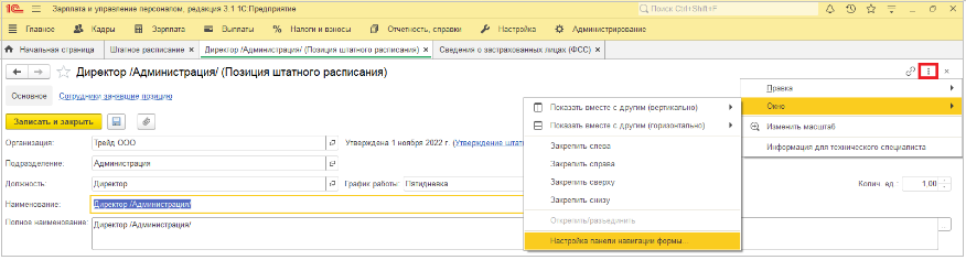 Чтобы отрегулировать данную обработку достаточно зайти в любую позицию штатного расписания и в правом верхнем углу кликнуть на три точки, затем навести курсор на раздел «Окно» и в открывшейся форме выбрать «Настройки панели навигации формы».