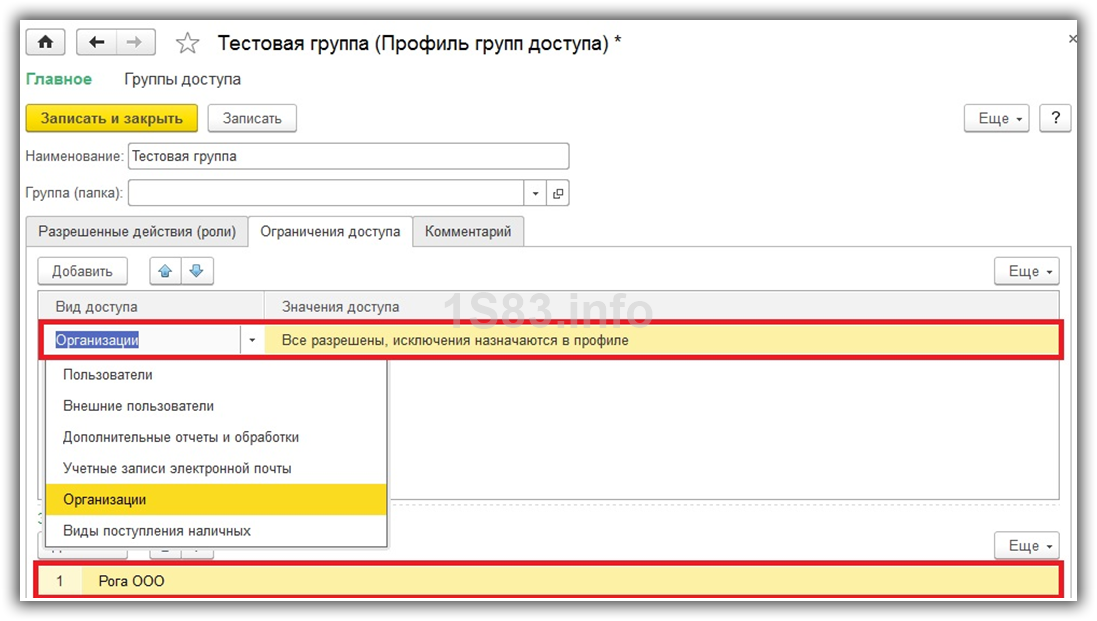 Предположим, мы хотим, чтобы пользователи, которым назначена тестовая группа, имели доступ к данным по всем организациям данной информационной базы, за исключением тех, что указаны в профиле.