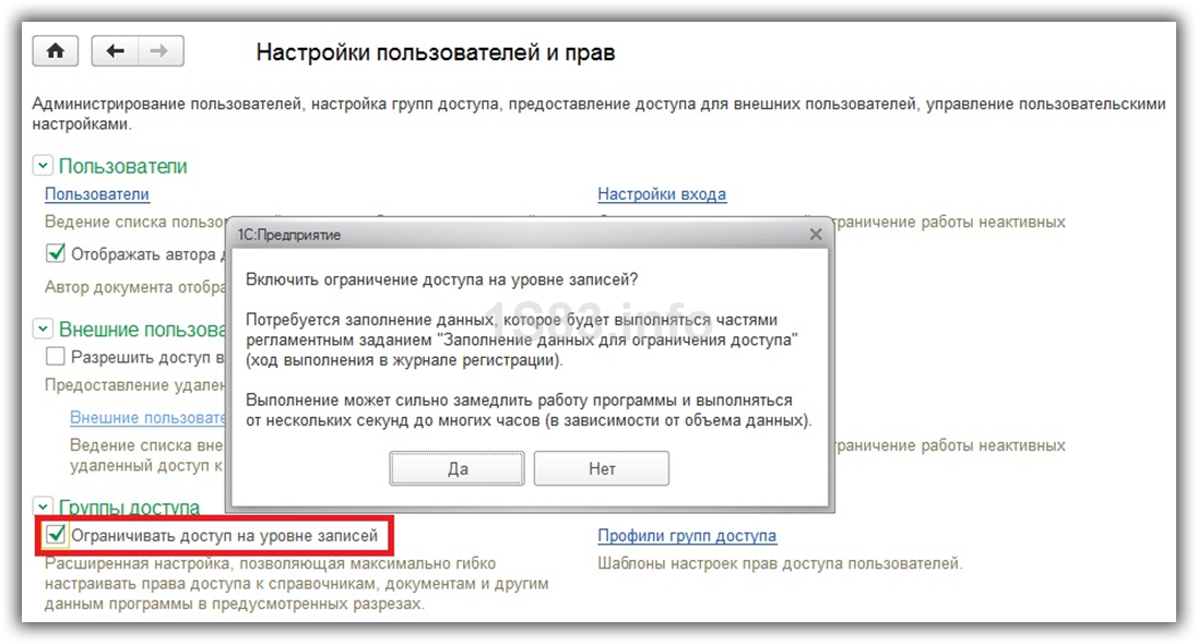 Для разграничения прав доступа в 1С Предприятие 8.3 используются «Права», «Роли», справочники «Пользователи», «Группы доступа» и «Профили групп доступа».