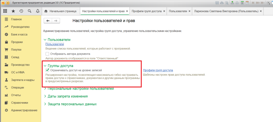 Позволяет более гибко настраивать доступ к данным программы в определенных разрезах. Для ее активации установите флаг на одноименном пункте формы настройки пользователей и прав.