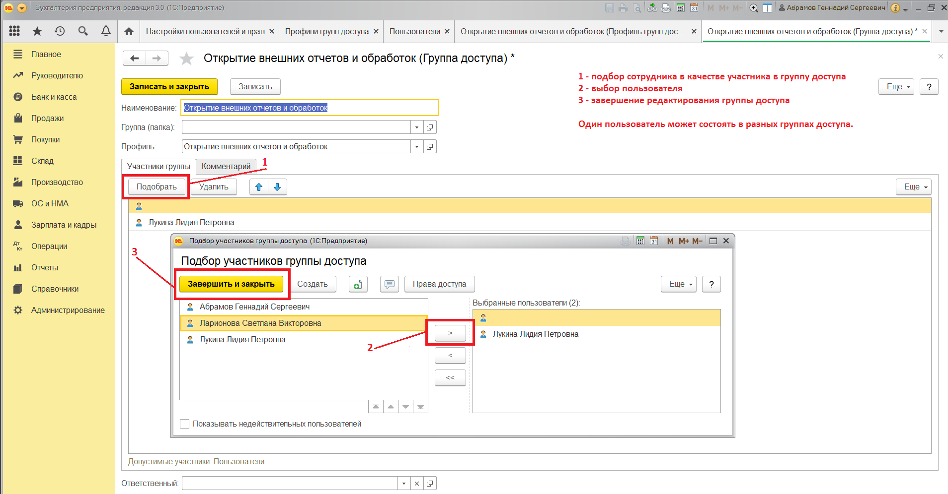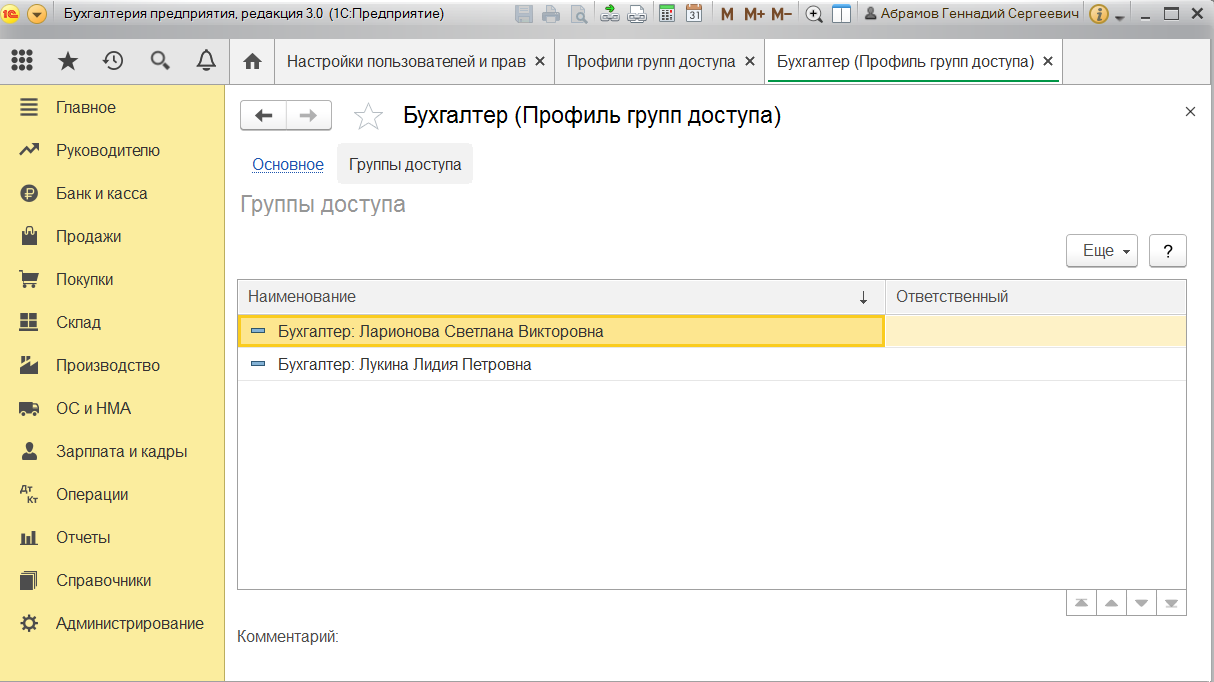 Смысл и назначение этого справочника состоит в том, что в нём перечисляются пользователи (участники), которые будут обладать всеми правами закреплённого в нём профиля группы доступа.