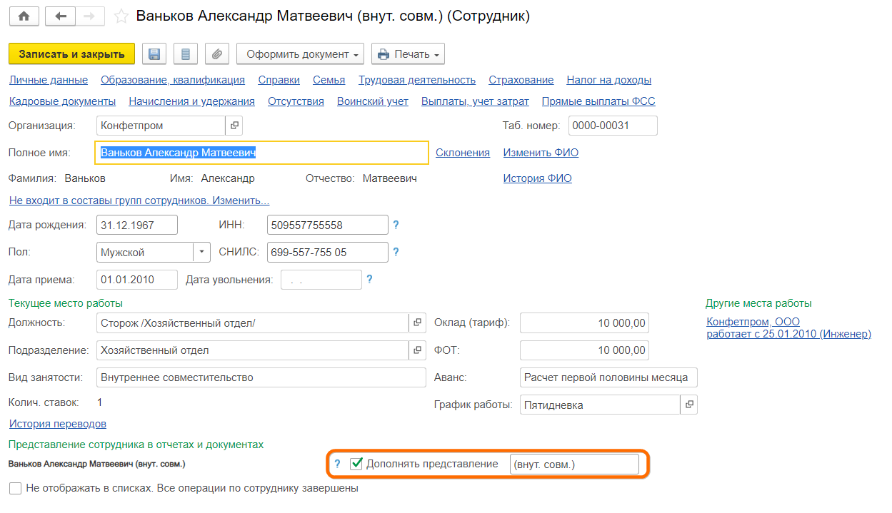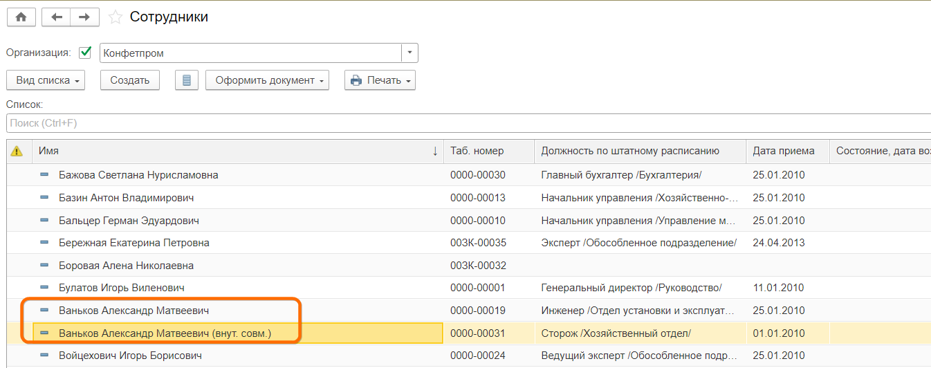 Если есть необходимость принять работника по внутреннему совместительству или принять на работу ранее уволенного (особенно в текущем году!) работника, в справочнике Сотрудники нужно создать новую строку с такими же ФИО.