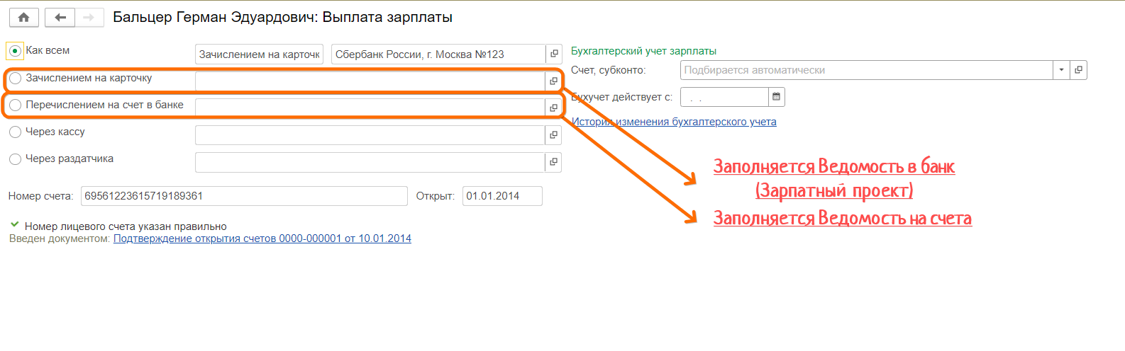 Перечислением на счет в банке – при выборе этого способа сотрудник при заполнении попадает автоматически в Ведомость на счета.