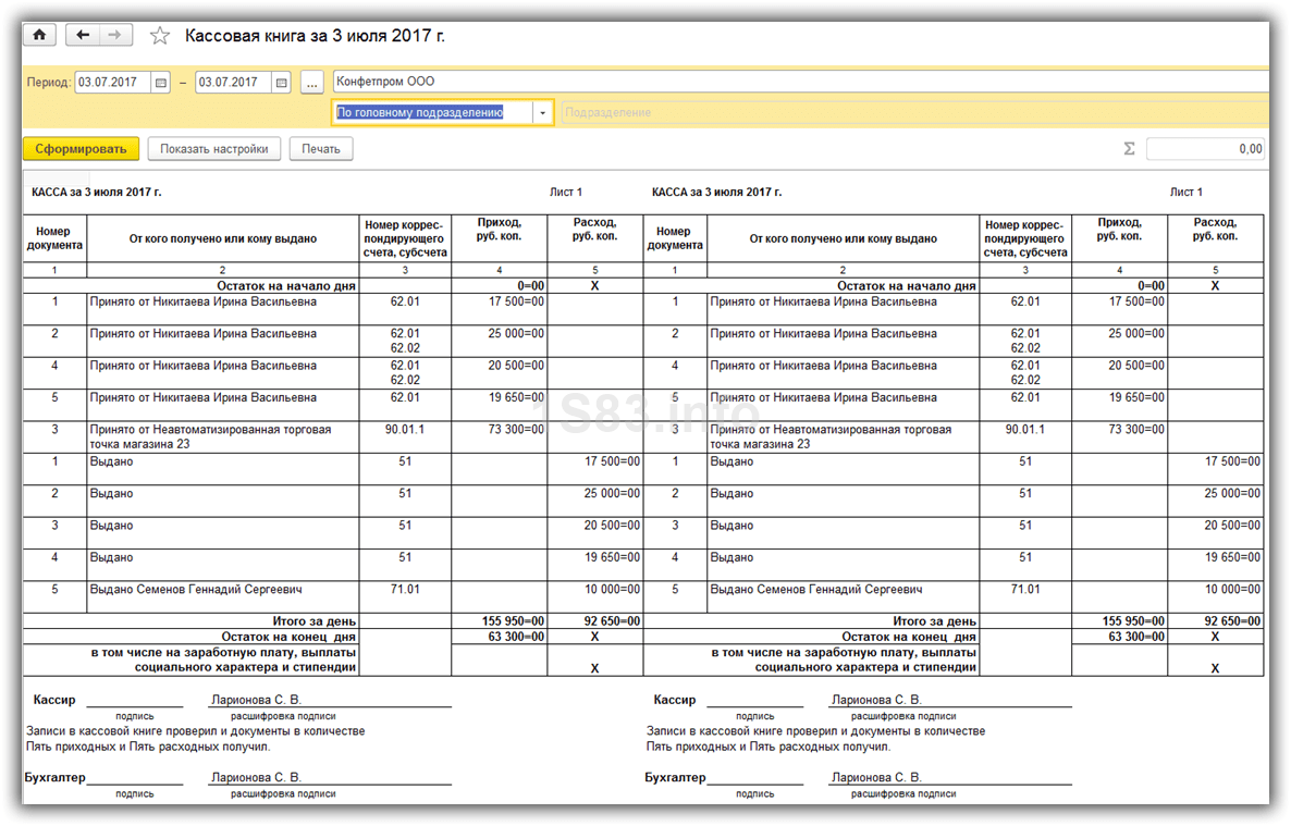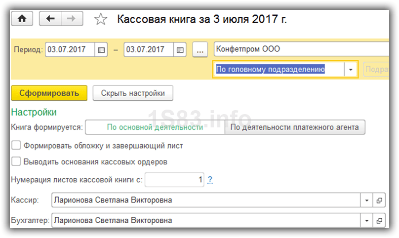 Здесь вы можете указать, как будет формироваться кассовая книга, и некоторые из настроек по ее оформлению в 1С.
