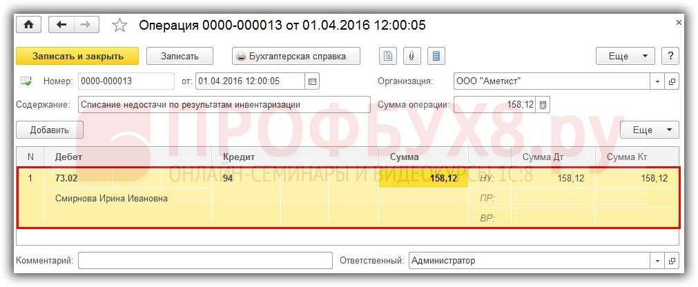 - Счет дебета – 94 «Недостачи и потери от порчи ценностей»;