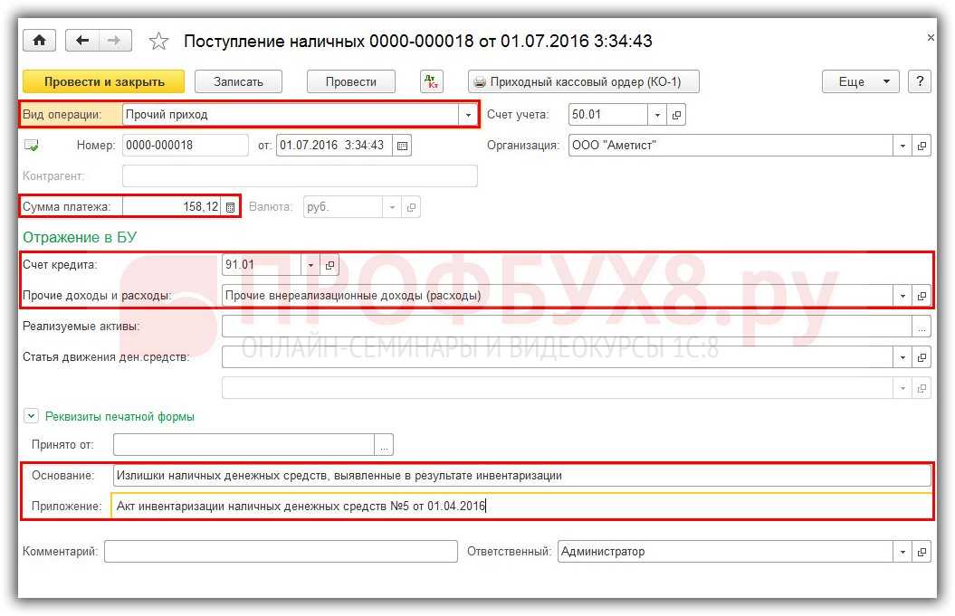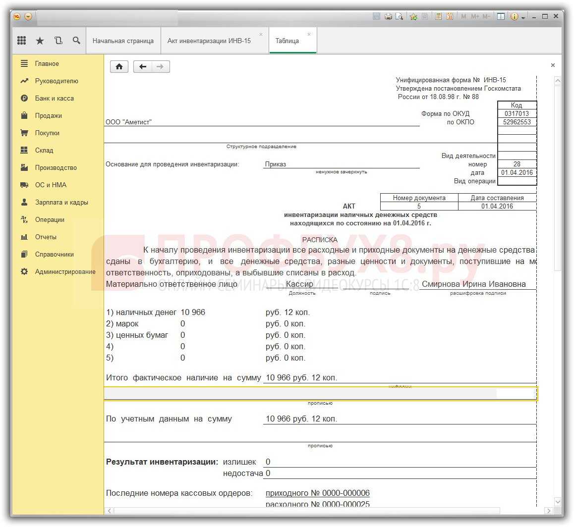 Инвентаризация денежных средств в кассе в 1С 8.3