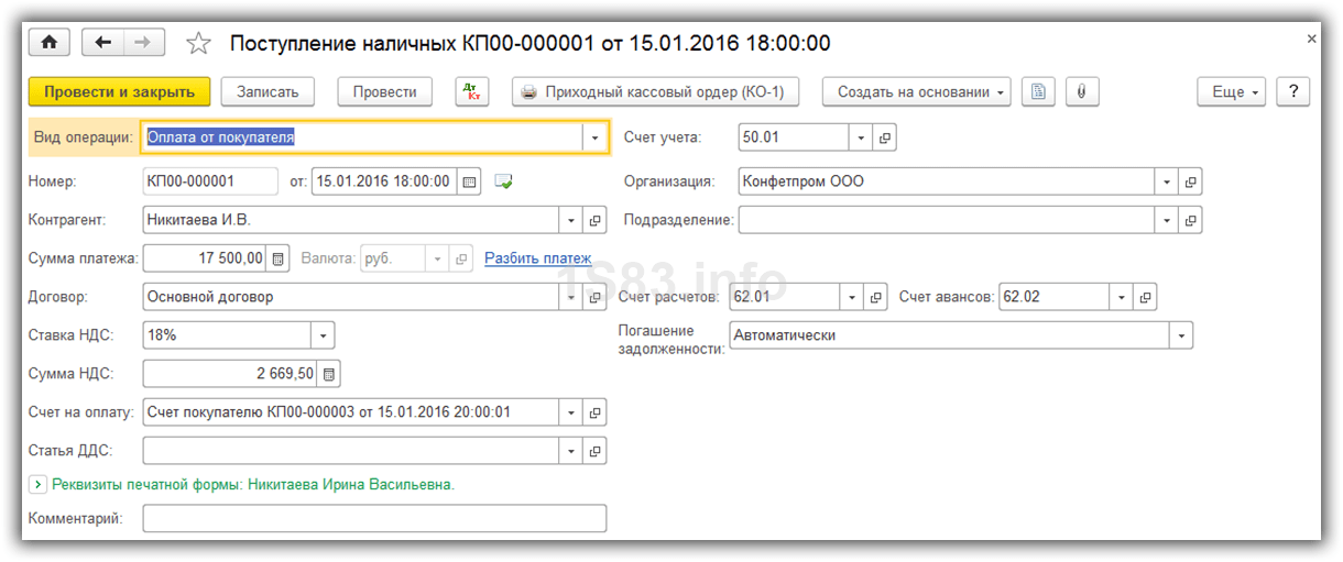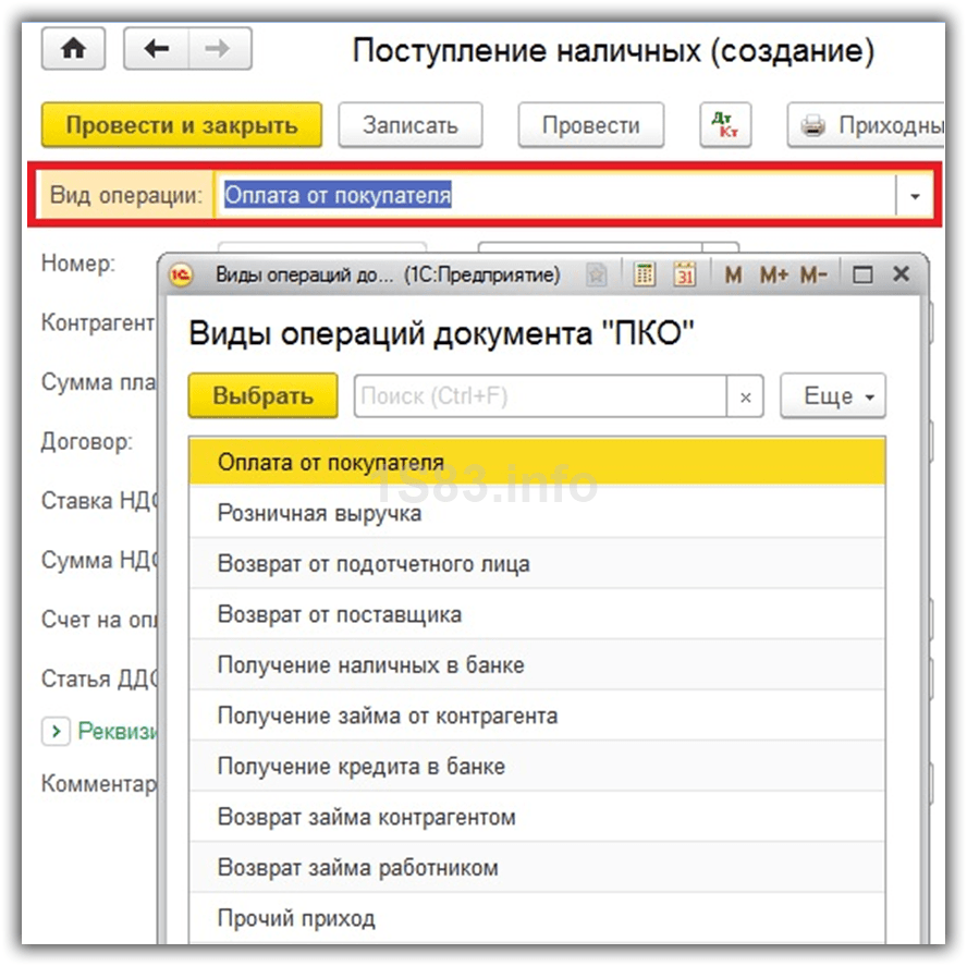 В приходном кассовом ордере 1С 8.3 при выборе данного вида операции заполняется контрагент, сумма и договор. Так е, при необходимости есть возможность настройки НДС, статьи ДДС (если по ним ведется учет) и счетов, по которым в дальнейшем будут выполнены движения.