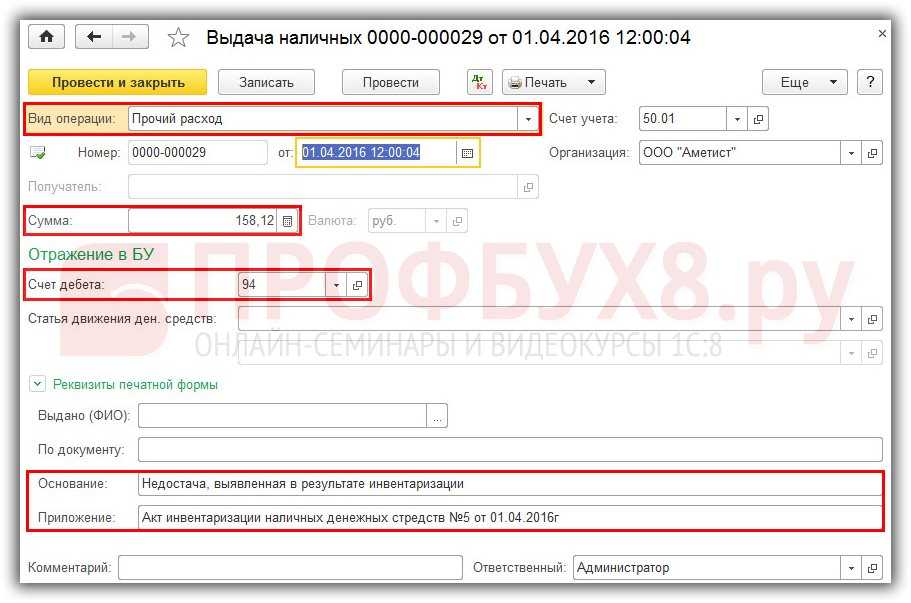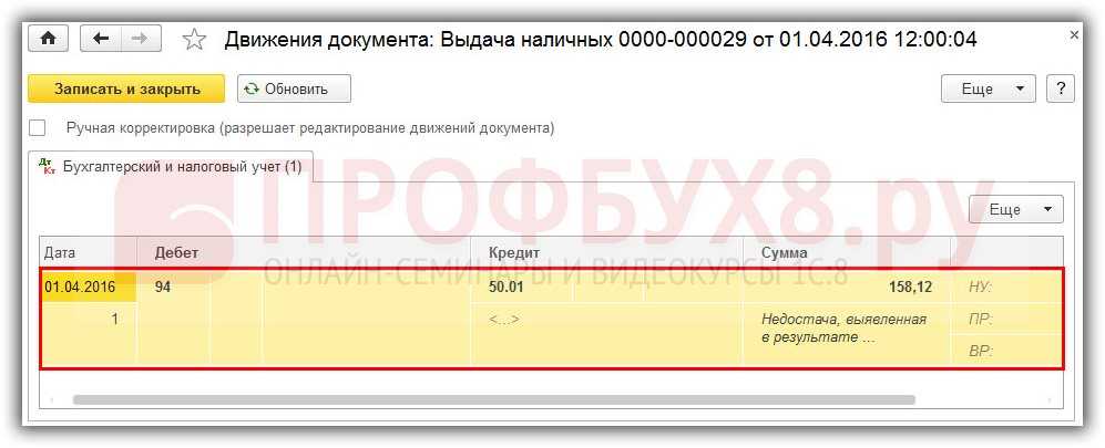 - списание недостающих денег в кассе;