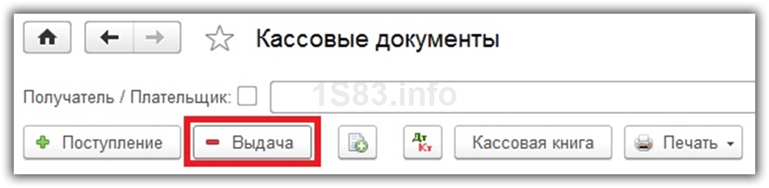 Для создания РКО в списке кассовых документов 1С 8.3 необходимо нажать на кнопку «Выдача».