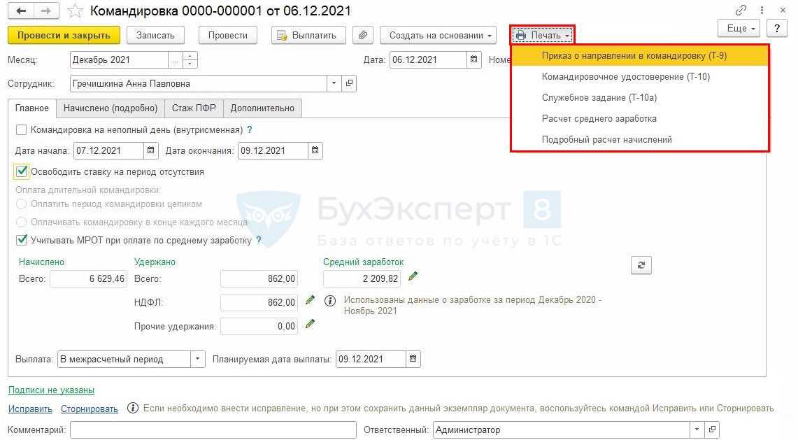 После заполнения данных и утверждения документа руководителем, необходимо сгенерировать печатные формы и отчеты для использования во время командировки:
