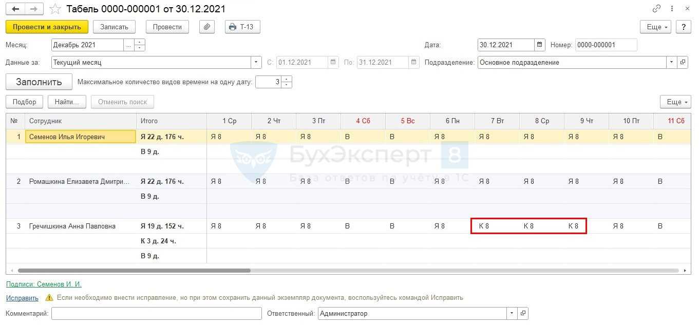 Зарегистрируем отсутствия по сотрудникам одним из двух способов: