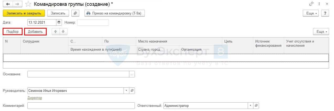 | 4 | Указать сотрудника, отправляющегося в командировку, и ответственного лица. |