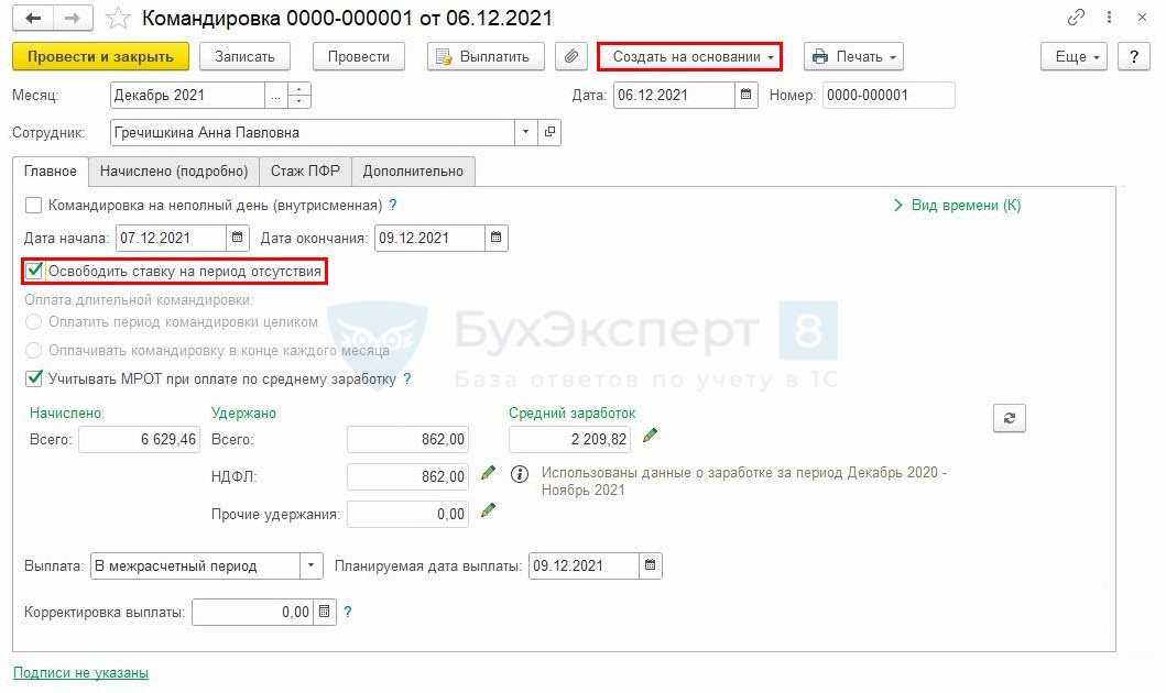 Затем заполняются даты начала и окончания расчетного периода (командировки). Если требуется освободить ставку в период отсутствия сотрудника, выставляется галочка напротив соответствующего пункта формы. Расчет среднего заработка и начисление происходит автоматически на основе данных за предыдущий период.