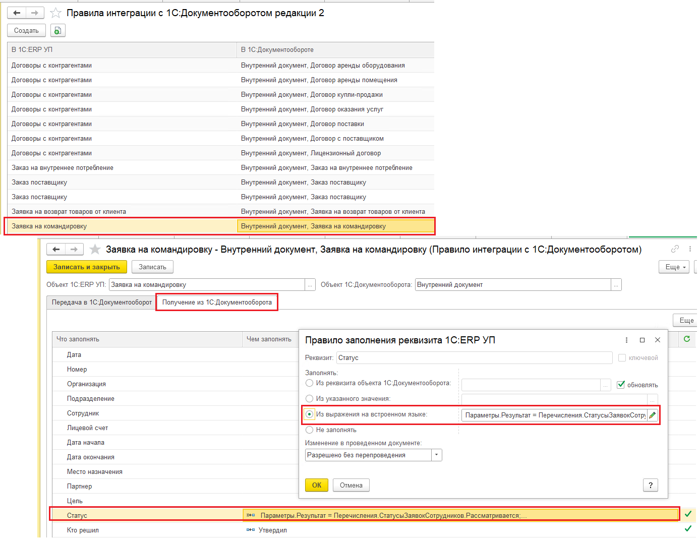 Чтобы запустился процесс согласования через 1С:Документооборот необходимо настроить Интеграцию с 1С:Документооборот. Как это делается есть множество публикаций в Интернет, но об одном нюансе там не сказано — это настройка обмена статусами в правилах интеграции между Документооборотом и ERP.