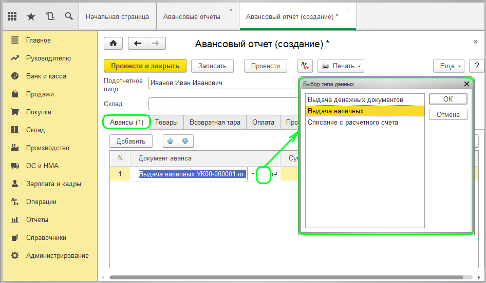 - Потом в колонке «Документ аванса» и в окне «Выбор типа данных» нажимаем на пункт «Выдача наличных».