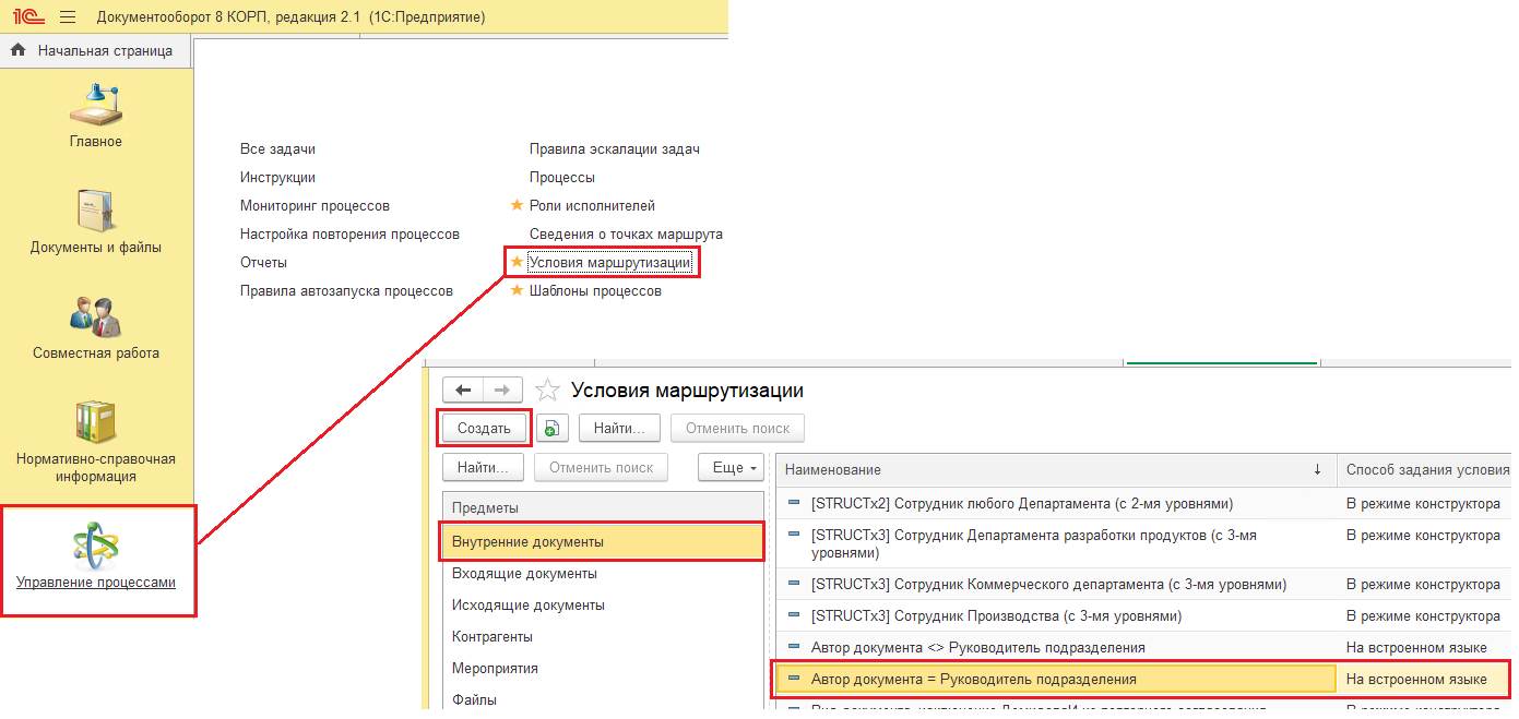 Чтобы настроить условия маршрутизации в 1С Документооборот, переходим в раздел «Управление процессами» и выбираем меню «Условия маршрутизации».
