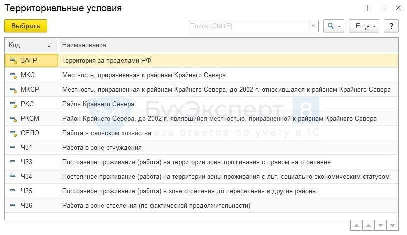 Если работник отправлен в командировку в местность с особыми территориальными условиями, на вкладке Стаж ПФР установим флажок На период командировки изменились территориальные условия. Из предложенного списка кодов выберем те условия, в которых сотрудник будет находиться в период командировки.