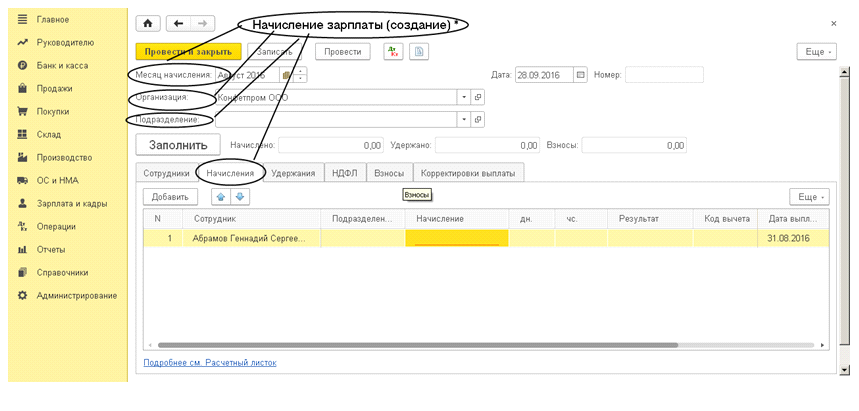 В документе по начислению, необходимо в шапке документа заполнить такие поля: